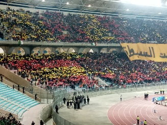 When Esperance scored, the homes fans came to life, but it soon faded again and Raja supporters took up the cheering and singing. There appeared to be four groups of Raja supporters, identified by large banners / flags that they held aloft, the most noticeable being the Ultras. Whilst the majority of Raja fans were young Moroccan males, there were also a lot of young females and some young children. Most had something ‘green’. Scarves, shirts and flags draped round shoulders were the dress of choice. And because the green Raja kit clashed with the Red and Yellow striped shirts of Esperance, for this game Raja wore their away kit – all white.